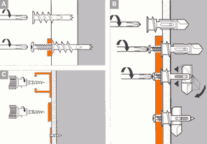 Driva® Plus works in the same way as Driva® in plasterboard, but is designed for fixing heavier loads. The additional hinged toggle swivels and pulls towards the inner face of the cavity through the action of the mounting screw. This gives a combined screw and clamp fix.